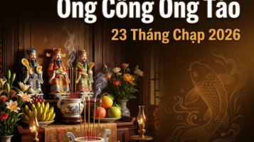 Văn khấn Ông Công Ông Táo 23 tháng Chạp 2026 đầy đủ. Hướng dẫn sườn lễ, giờ cúng, cách thả cá chép, mâm cúng đúng chuẩn.
