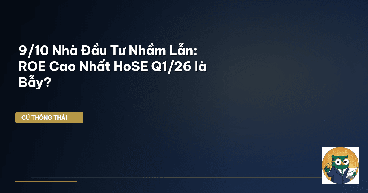 ⏱️ 11 phút đọc · 2130 từ Giới Thiệu: ROE Cao Nhất HoSE Q1/26 – Lời Mời Gọi Hay Báo Động Đỏ? Mấy nay, Cú nhận được nhiều câu hỏi của anh em F0, Fx xoay quanh cái chỉ số ROE (Return on Equity – Tỷ suất sinh lời trên vốn chủ sở hữu). Nghe đồn râm ran về những doanh nghiệp có ROE cao ngất ngưởng trong Quý 1 năm 2026 . Nhưng mà, con số càng đẹp, càng dễ làm người ta…mê muội, đúng không? Ai cũng muốn tìm "viên ngọc quý" trên sàn, một công ty làm ăn hiệu quả, kiếm tiền giỏi giang cho cổ đông. Và ROE, t…