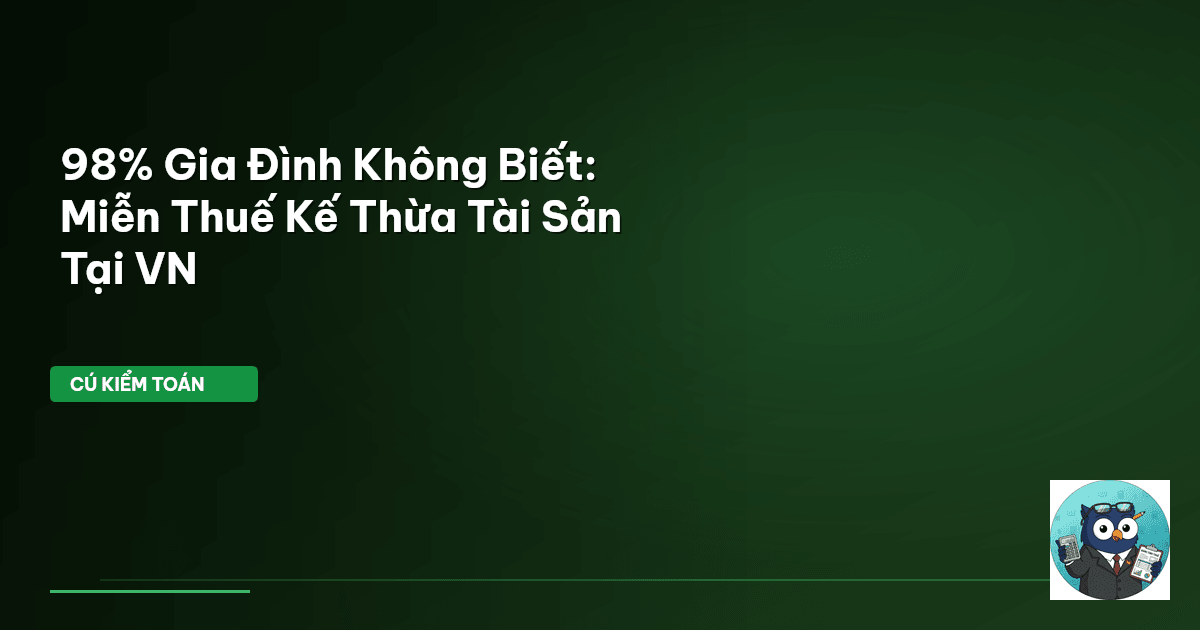 ⏱️ 14 phút đọc · 2715 từ Giới Thiệu: Đừng Để Thuế "Nuốt Chửng" Tài Sản Gia Đình Tài sản tích lũy qua nhiều thế hệ là thành quả lao động, là di sản quý báu. Tuy nhiên, ít ai nghĩ đến việc chuyển giao tài sản này cũng đi kèm với nghĩa vụ thuế. Nếu không có chiến lược rõ ràng, giá trị tài sản có thể bị giảm đáng kể bởi các khoản thuế không đáng có. Cú Kiểm Toán đã soi kỹ hàng nghìn hồ sơ. Chúng tôi thấy rằng phần lớn các gia đình Việt Nam chưa thực sự hiểu rõ về quy định thuế khi thực hiện việc chu…