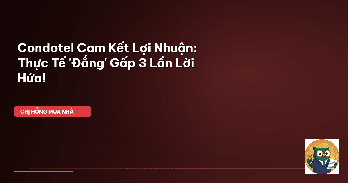 ⏱️ 11 phút đọc · 2165 từ Giới Thiệu: Cam Kết Lợi Nhuận Condotel – Ngọt Ngào Hay 'Đắng Chát'? Chào cả nhà Cú Thông Thái! Chị Hồng BĐS đây. Mấy nay lướt mạng, chị thấy nhiều ba má, ông bà cứ hỏi tới hỏi lui về chuyện đầu tư condotel với cam kết lợi nhuận . Nghe thì có vẻ hấp dẫn lắm đúng không? Kiểu như mua một căn nghỉ dưỡng vừa để cho thuê sinh lời, vừa có thể đi nghỉ miễn phí vài ngày trong năm. Lợi nhuận cam kết 8-12% một năm, nghe bùi tai thật sự. Nhưng mà các mẹ bỉm ơi, đời đâu có như là mơ …