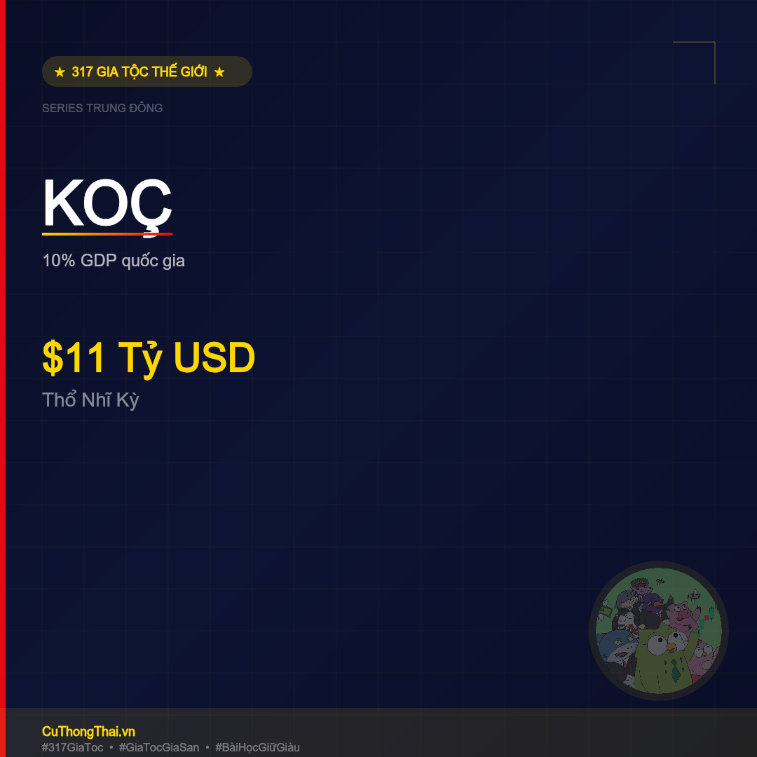 🦉 Bạn ơi, gia tộc Koç là bài học về "national champion" (nhà vô địch quốc gia — khi 1 gia tộc đóng vai trò xương sống của cả nền kinh tế). Koç Holding = #1 Thổ Nhĩ Kỳ, Fortune 500 #191 — doanh thu $65.8 tỷ = 7% GDP cả nước. Từ cửa hàng tạp hóa ở Ankara (1917) của Vehbi Koç đến tập đoàn 130,000+ nhân viên với Ford, Beko, Tüpraş, Yapı Kredi. Bài học: đa dạng hóa cực đại + liên doanh quốc tế + CEO chuyên nghiệp = vượt qua 3 cuộc đảo chính, bất ổn chính trị, và lạm phát 80%.