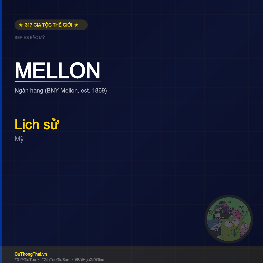 "Thomas Mellon: nhập cư Ireland, thẩm phán, rồi ngân hàng 1869. Andrew Mellon: Bộ trưởng Tài chính 3 đời TT, Alcoa, Gulf Oil, National Gallery. BNY Mellon $3.9 ngàn tỷ — nhưng gia đình không còn liên quan. $14 tỷ."