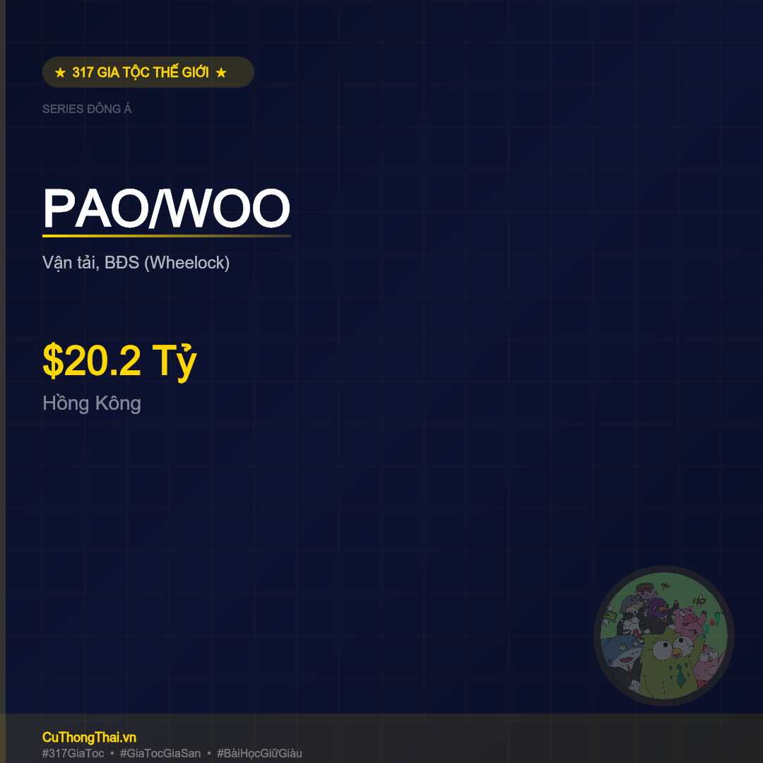 Trong series nghiên cứu 317 gia tộc hùng mạnh nhất thế giới, gia tộc Pao/Woo là một trong những case study đáng chú ý nhất từ Đông Á. Với tài sản ước tính $20.2 Tỷ, câu chuyện của họ chứa đựng những bài học sâu sắc về xây dựng, bảo toàn và chuyển giao tài sản qua nhiều thế hệ.
