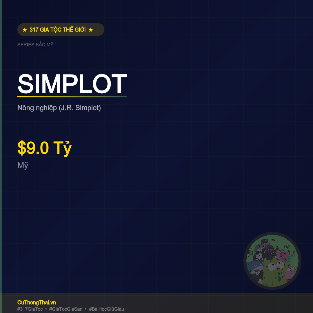 Gia tộc Simplot có tổng tài sản ước tính tài sản **$3.6 tỷ USD, chủ yếu trong ngành công nghệ. J.R. Simplot — bỏ học lớp 8, bắt đầu từ 14 tuổi với heo + khoai tây Idaho. Phát minh khoai tây chiên đông lạnh (1953). Handshake deal với Ray Kroc → cung cấp 50%+ khoai chiên cho McDonald's toàn cầu. .