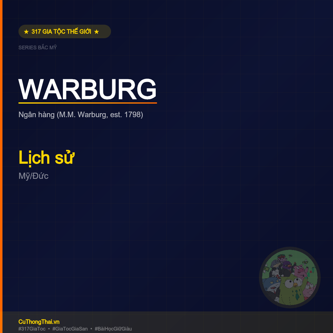 Gia tộc Warburg — gốc Do Thái, Venice → Warburg (Đức) → Hamburg. M.M. Warburg & Co (1798) = ngân hàng đầu tư lâu đời nhất còn tồn tại. Paul Warburg thiết kế Federal Reserve (Ngân hàng Trung ương Mỹ, 1913). Eric Warburg sáng lập Warburg Pincus (PE). S.