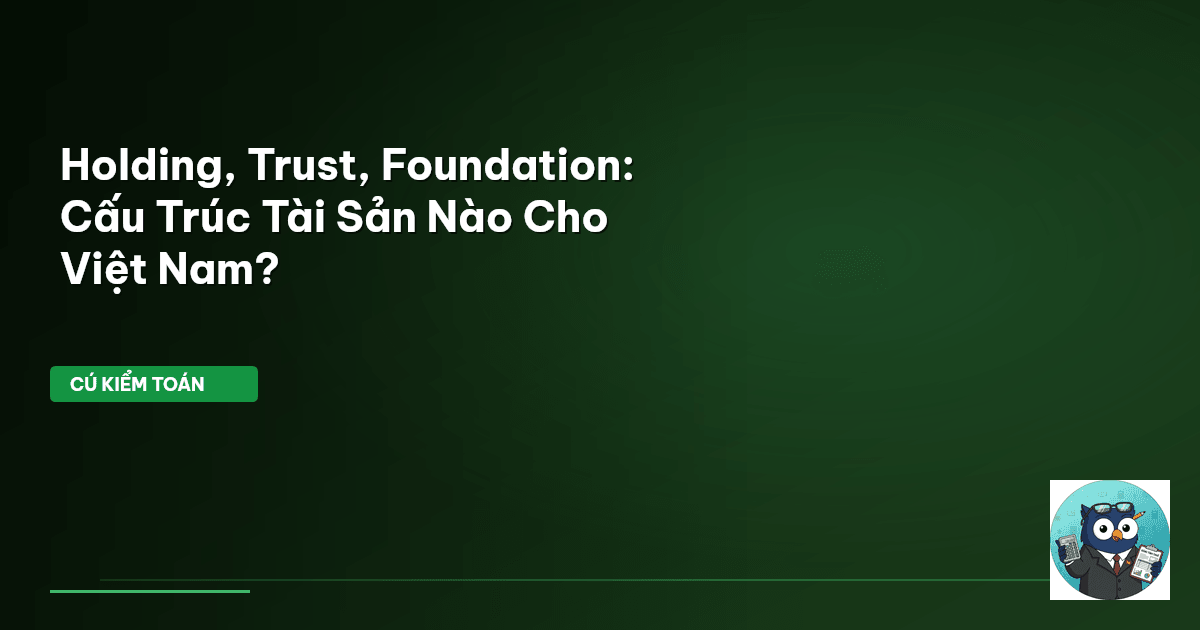 ⏱️ 16 phút đọc · 3021 từ Giới Thiệu: Bài Toán Tối Ưu Tài Sản Tại Việt Nam Trong thế giới tài chính phức tạp, các cá nhân và doanh nghiệp có tài sản lớn luôn tìm kiếm những cấu trúc tối ưu để bảo vệ, phát triển và chuyển giao gia sản của mình. Ba khái niệm thường được nhắc đến là Holding Company, Trust (Quỹ Tín Thác) và Foundation (Quỹ). Tuy nhiên, Cú Kiểm Toán phải thẳng thắn khẳng định: Việc áp dụng và hiệu quả của các cấu trúc này tại Việt Nam có những khác biệt rất lớn so với chuẩn mực quốc t…