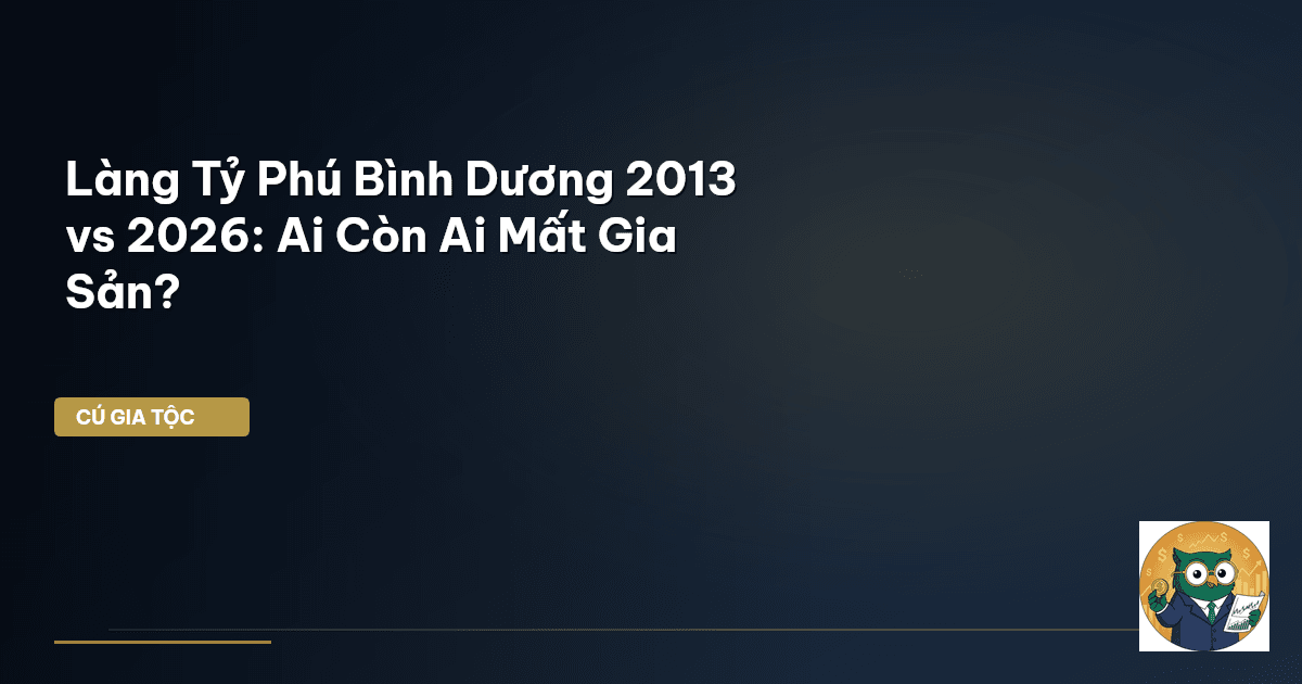 ⏱️ 15 phút đọc · 2956 từ Chào mừng đến với câu chuyện của 'Làng Tỷ Phú' Bình Dương: 2013 và 2026 Ông bà chúng ta vẫn thường nói: "Tiền bạc như nước chảy qua kẽ tay". Câu nói đó có lẽ chưa bao giờ đúng hơn trong bối cảnh tốc độ phát triển chóng mặt của Việt Nam, nơi nhiều gia đình bỗng chốc trở thành "tỷ phú đất" rồi lại đối mặt với nguy cơ mất mát. Đặc biệt, câu chuyện về cái gọi là 'Làng Tỷ Phú' ở Bình Dương , nơi những khối tài sản khổng lồ được tích lũy chỉ trong vài năm, đã trở thành một điể…