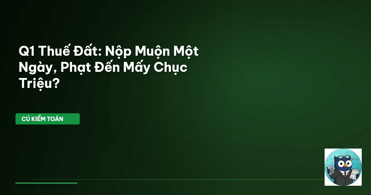 ⏱️ 14 phút đọc · 2792 từ Giới Thiệu: Đừng Để Tiền Phạt BĐS "Đốt" Ví Bạn! Hỡi những người nộp thuế thông thái! Chuông báo động của Cú Kiểm Toán đang reo. Thời hạn nộp thuế bất động sản (BĐS) Quý 1 đang đến rất gần. Việc chậm trễ dù chỉ một ngày có thể khiến bạn đối mặt với các khoản phạt tiền chậm nộp không hề nhỏ. Theo Điều 59 Luật Quản lý thuế số 38/2019/QH14 , mức phạt là 0.03% mỗi ngày trên số tiền thuế chậm nộp. Con số này, khi tích lũy, có thể gây ra những thiệt hại tài chính đáng kể cho cá…