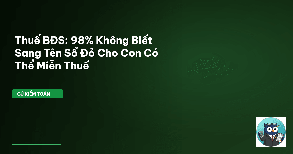 Chuyển nhượng bất động sản cho con cái là một giao dịch trọng đại. Tuy nhiên, nhiều người lo ngại về gánh nặng thuế và phí có thể lên đến hàng trăm triệu đồng. Tin tức tốt lành: Cú Kiểm Toán sẽ chỉ ra rằng, phần lớn nỗi lo này là không cần thiết nếu bạn nắm rõ luật. Không ít người đang bỏ qua cơ hội miễn thuế hoàn toàn khi sang tên sổ đỏ cho con. Vậy thực hư thế nào?